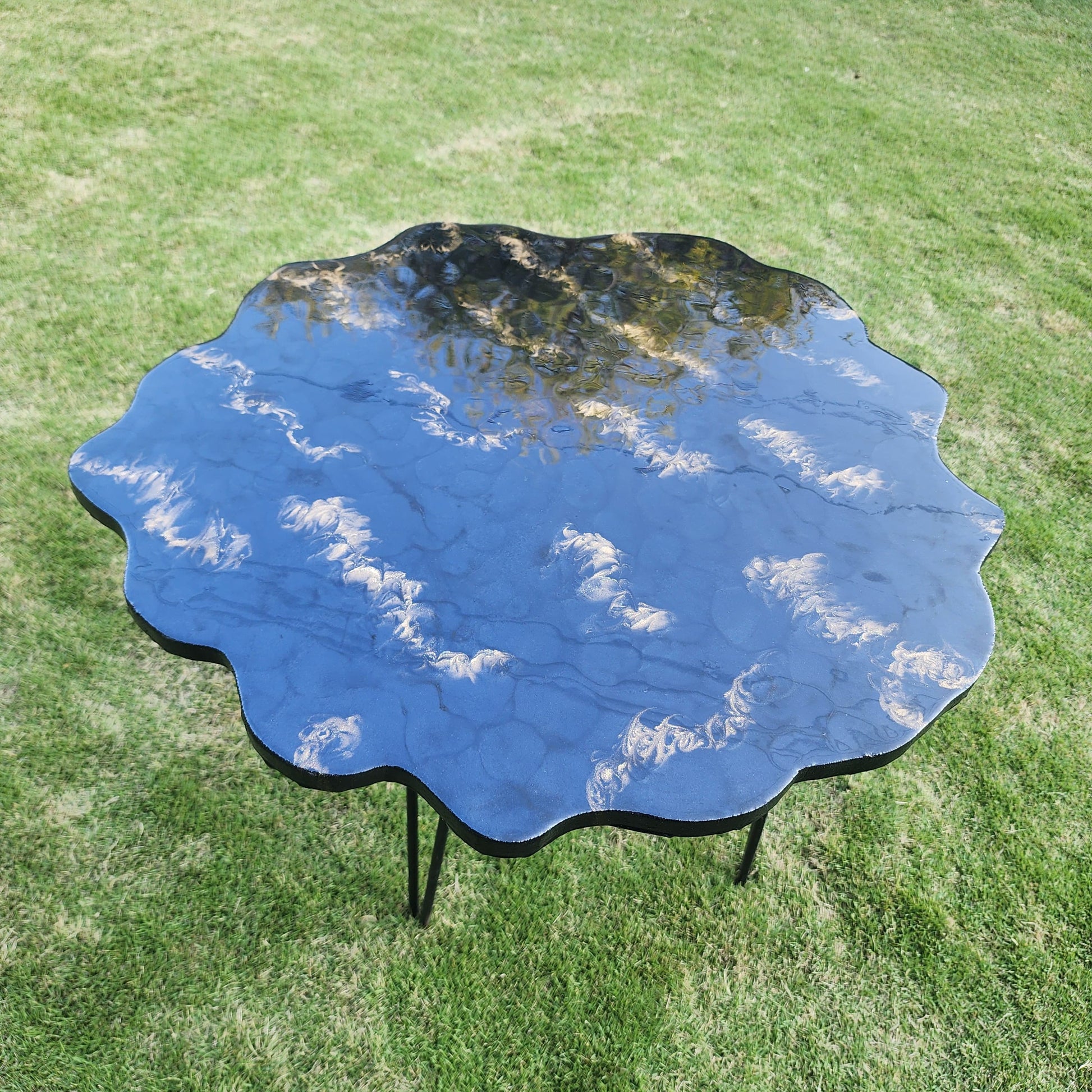 Handcrafted black and gold wooden (MDF) resin table with elegant iron tripod legs. The intricate resin design and sleek finish create a luxurious centerpiece for any space. A perfect blend of art and functionality, adding sophistication to your home decor.
