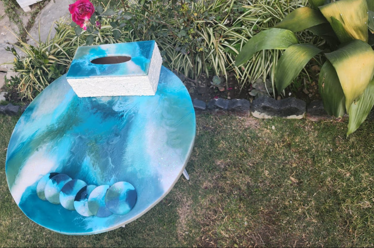 A stunning handcrafted wooden resin table with iron tripod legs, paired with a matching tissue box and coaster set. The vibrant resin art adds a unique, artistic flair, making this set a functional yet eye-catching addition to your living space. Perfect for adding a modern touch to any room.